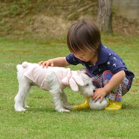 この子も生れて初めて洋服を着せました!最初は慣れない感覚にビックリしたのか「何これ~!?」とに寝転がってみたり、洋服をかじってみたりしていましたが、慣れてくると洋服を気にすること無く楽しそうに遊んでいました!