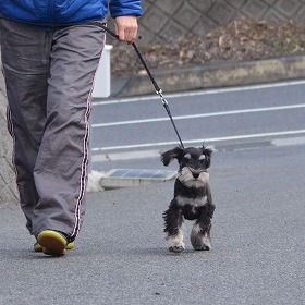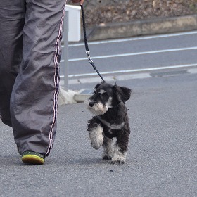 お散歩の練習では、最初の頃は自分の行きたい方向へリードを引っ張ったり、立ち止まったりと自由奔放に歩いていました。
