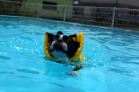 スタッフの方がお腹を支えて泳がせてくれましたが、手を離すと飼い主の呼ぶ声を無視して、水飛沫をあげて必死に近場の岸へ蛇行して泳いで行きました。
