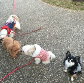 昨日の朝はマイナス6℃、今朝は0度でしたが雪が舞っていました。でももうすぐ春ですよねぇ。そういうにはまだ早いかなぁ(笑)。待ってました!!ももと娘さんのツーショット!2人とも目がクリンクリンですね。2人お揃いの紅い衣装で素晴らしい!お散歩中の一コマが実に良い空気感が伝わってまいります。シーズーにチワワにお友達が多いですね。愛犬の散歩は人と人を結びつけ、地域の交流や治安にも大いに役立っています。「飼い主良し、愛犬良し、近所良し」の三方(散歩)良し(近江商人)の精神です(笑)!僕は奈良好きですからしょっちゅう奈良を訪問していますが、数年前から名古屋も好きな街になりました。あの広い道、都会ですから便利ですし何でもあります。お子さんができたら名古屋市科学館や鉄道博物館がお勧めです。商店街なら大須。デパートは奈良よりも多いです。テレビ塔のある辺りは都会的でおしゃれですが大阪のようではなくスッキリしています。僕は名古屋が大好きになりました。”お嬢様風”の名古屋に娘さんはぴったりだと思いますよ。いつかまたモトコランドへお越しください!アメリカでは「子供を産む前に子犬を育てなさい」とよくいいます。これ、科学的にも合理性が立証されている面がいくつかあります。ももが「名古屋犬」になるのか、娘さんがモトコランドを訪問するのかどっちでしょうねぇ(笑)。風邪(インフルエンザ)が流行っています。くれぐれもお気を付けください。モトコランド 井上 正樹