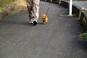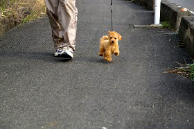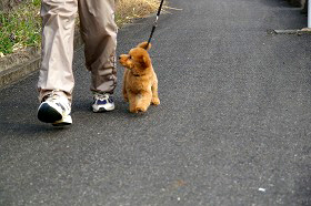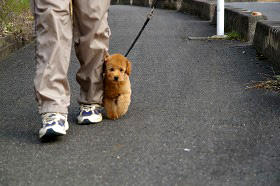 三重県のT様がご予約されているトイプードル(男の子、アプリコット)のモコ君です。 モコ君もお散歩の練習はとても順調で、上手に人の左側に付いてリーダーウォークしてくれています!時々夢中になってリードを引っ張ってしまうことがありますが、こちらが少しリードを引き戻すと、はっと我に返ったようなお顔で再びリーダーウォークしてくれます。