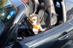 週末は車に乗せて郊外に散歩に連れ出しますが、窓から顔を出して気持ち良さそうに風に当たっています(飛び出し防止に2重にベルトをしています)。